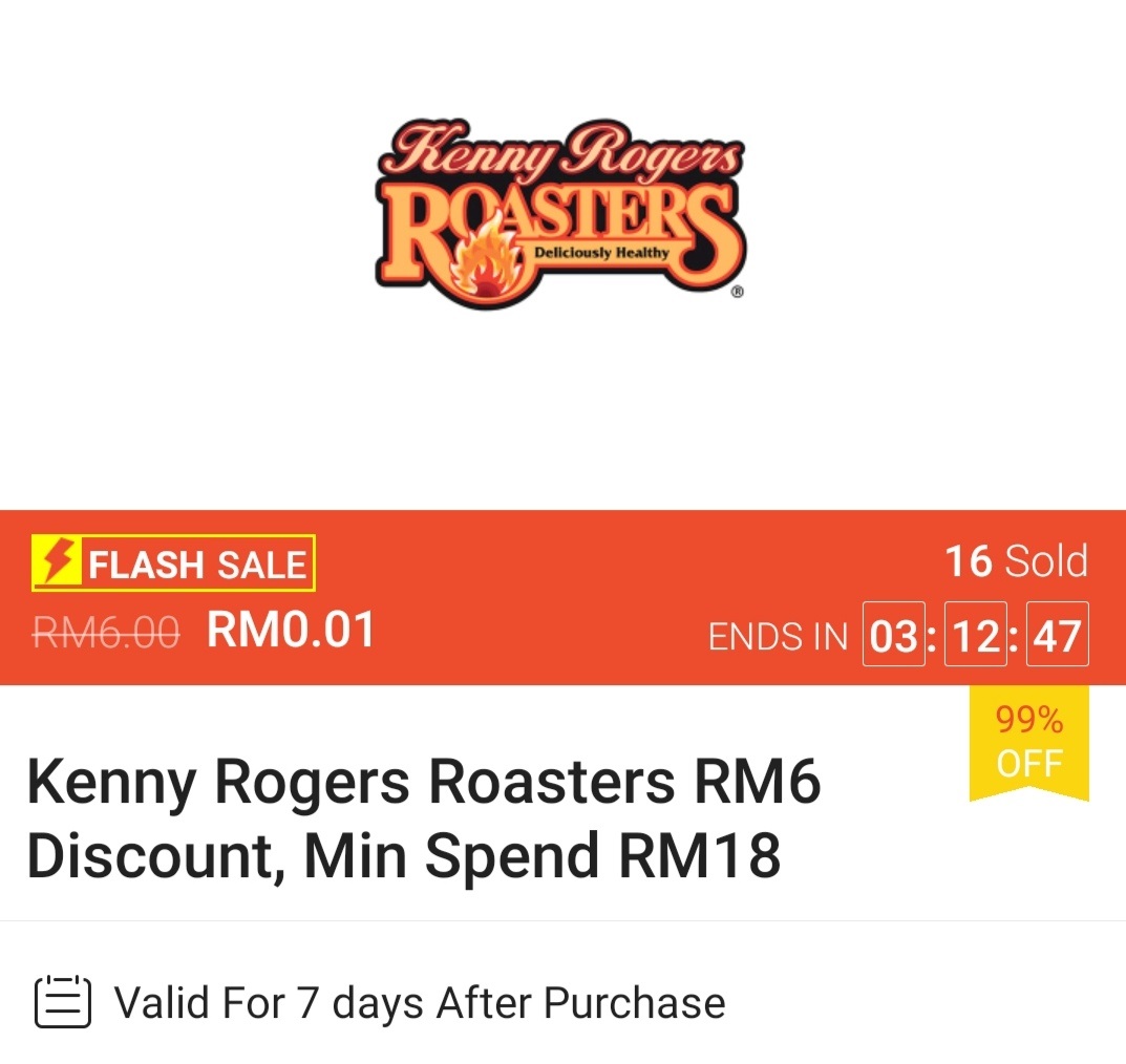 ▼ ⑤ Kenny Rogers Roasters – 消费满RM18 可享有RM6 现金回扣;购买【点击这里】