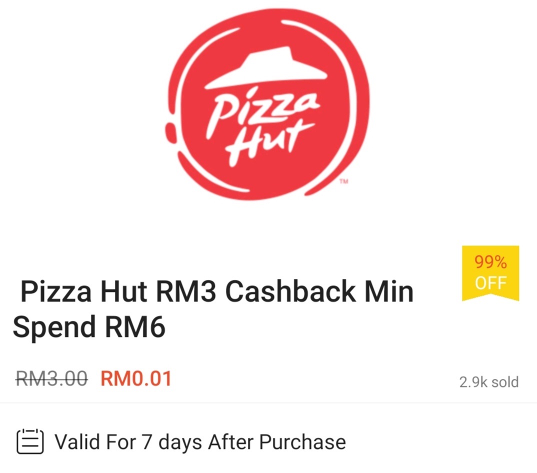 ▼ ① Pizza Hut – 消费满RM6 可获RM3 现金回扣;购买【点击这里】