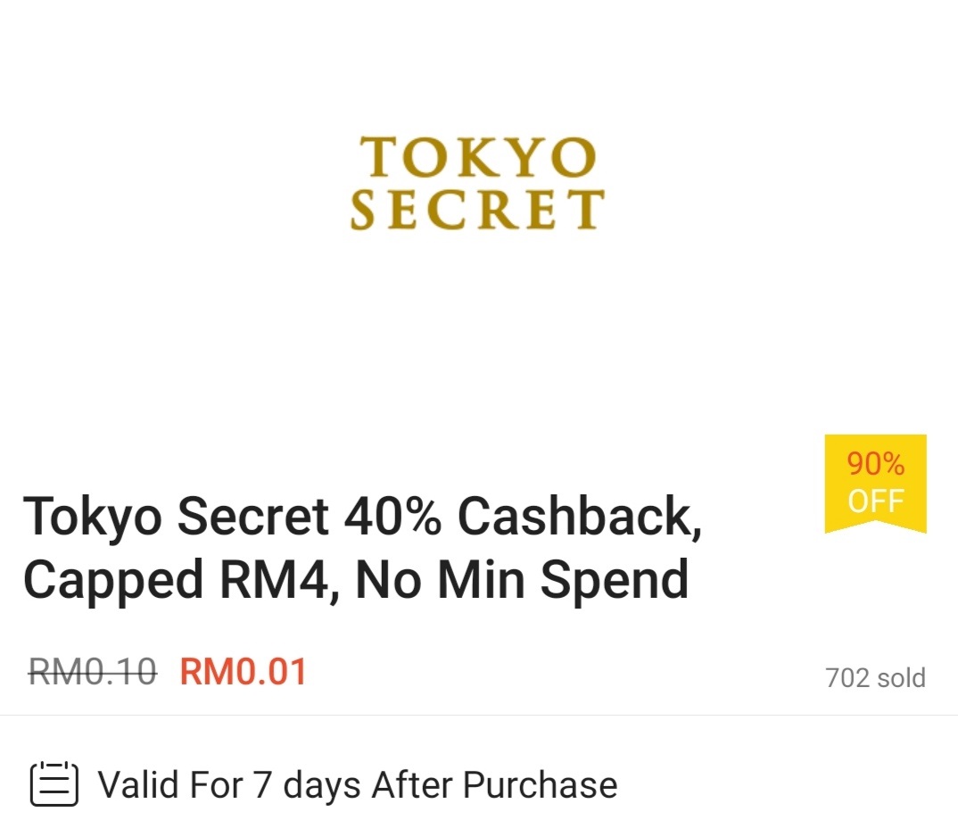▼ ⑬ Tokyo Secret – 40%现金回扣(最高折扣RM4 / 无需最低消费);购买【点击这里】