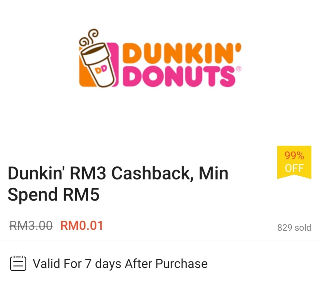 ▼ ⑫ Dunkin’ Donuts – 消费满RM5 可享有RM3 现金回扣;购买【点击这里】