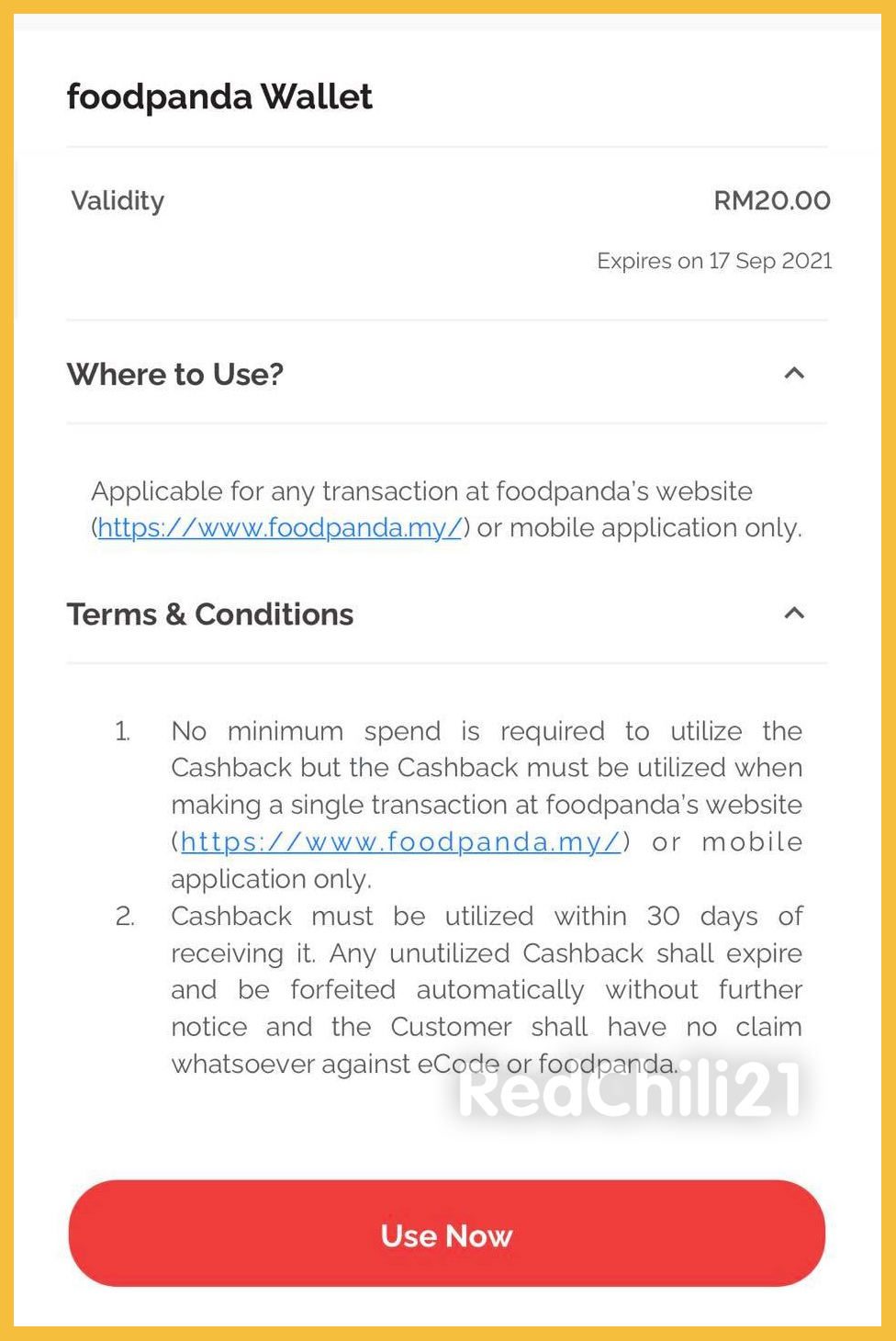 ※ 这张Foodpanda RM20 礼券是无限最低消费!(也就说下一次消费RM20可直接折扣RM20,等于免费请你吃啦!)