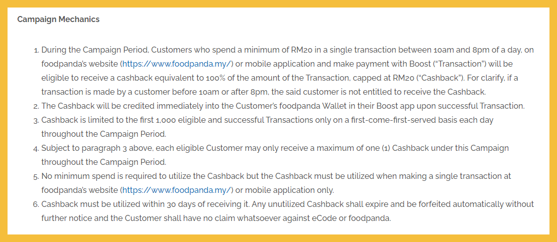 - 最低消费RM20(单张收据)才能获得100%回扣优惠(高达RM20)
