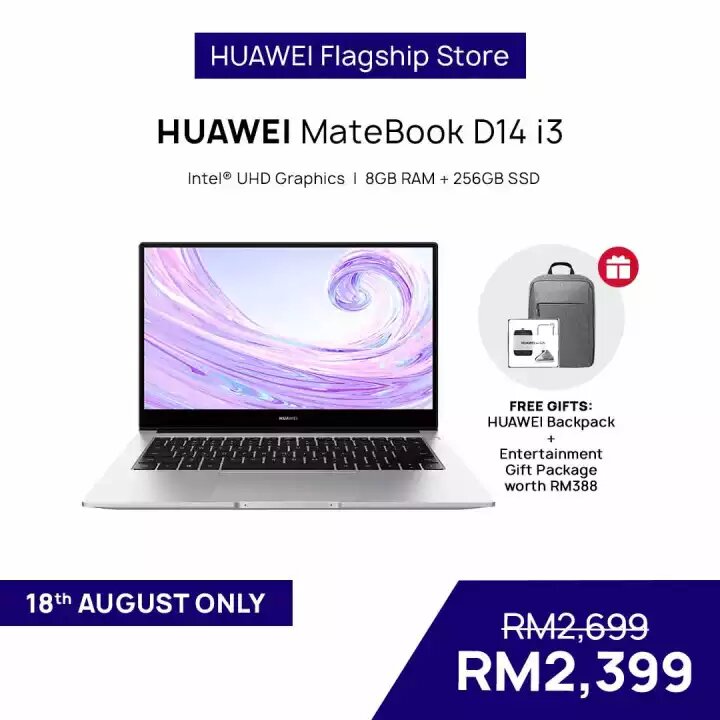▼ HUAWEI MateBook D14 i3 Laptop | 8GB + 256GB – 只需RM2399(原价RM2699)