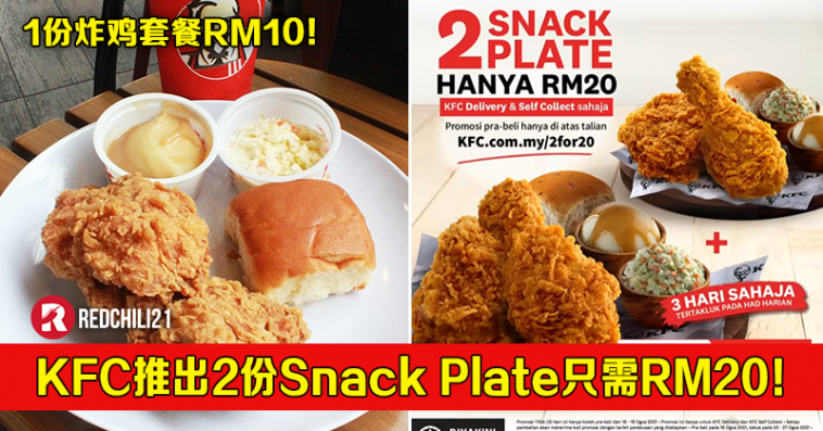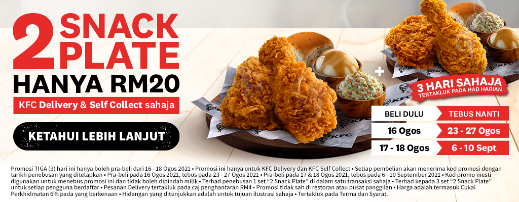从8月16日至8月18日,大马KFC 推出一项预购套餐优惠!2份Snack Plate 只需RM20,平均一份炸鸡套餐只需RM10!