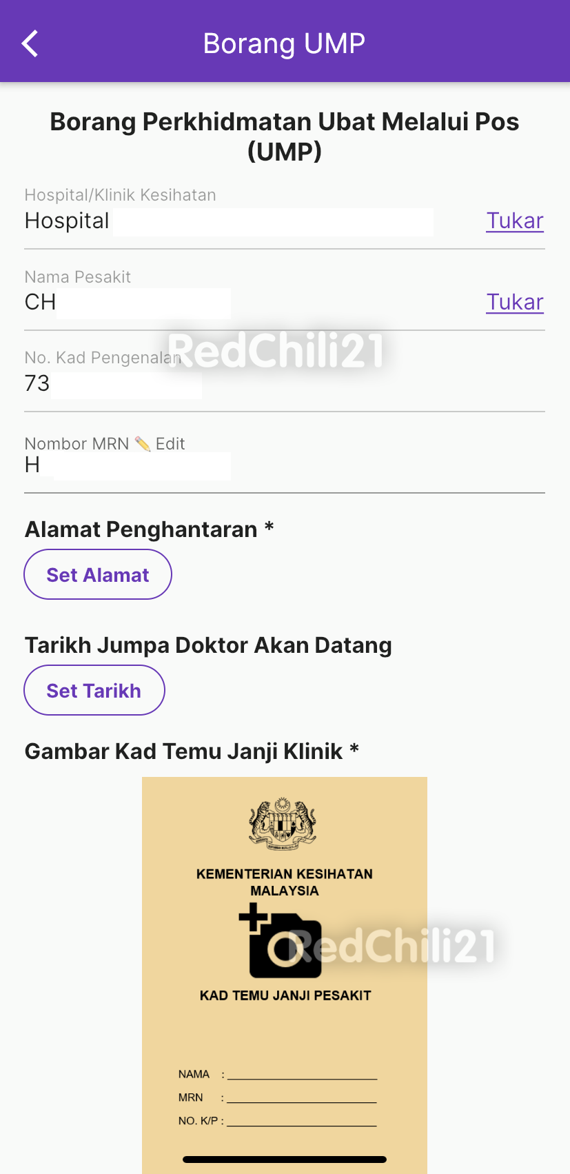 步骤6:填写邮寄资料并上传药卡,点击”Hantar“提交。