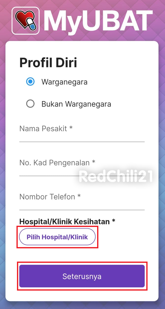 步骤3:填写病人名字、身份证号码、联系号码。选择你所在州属的医院或经常去的诊所。然后,点击“Seterusnya”。