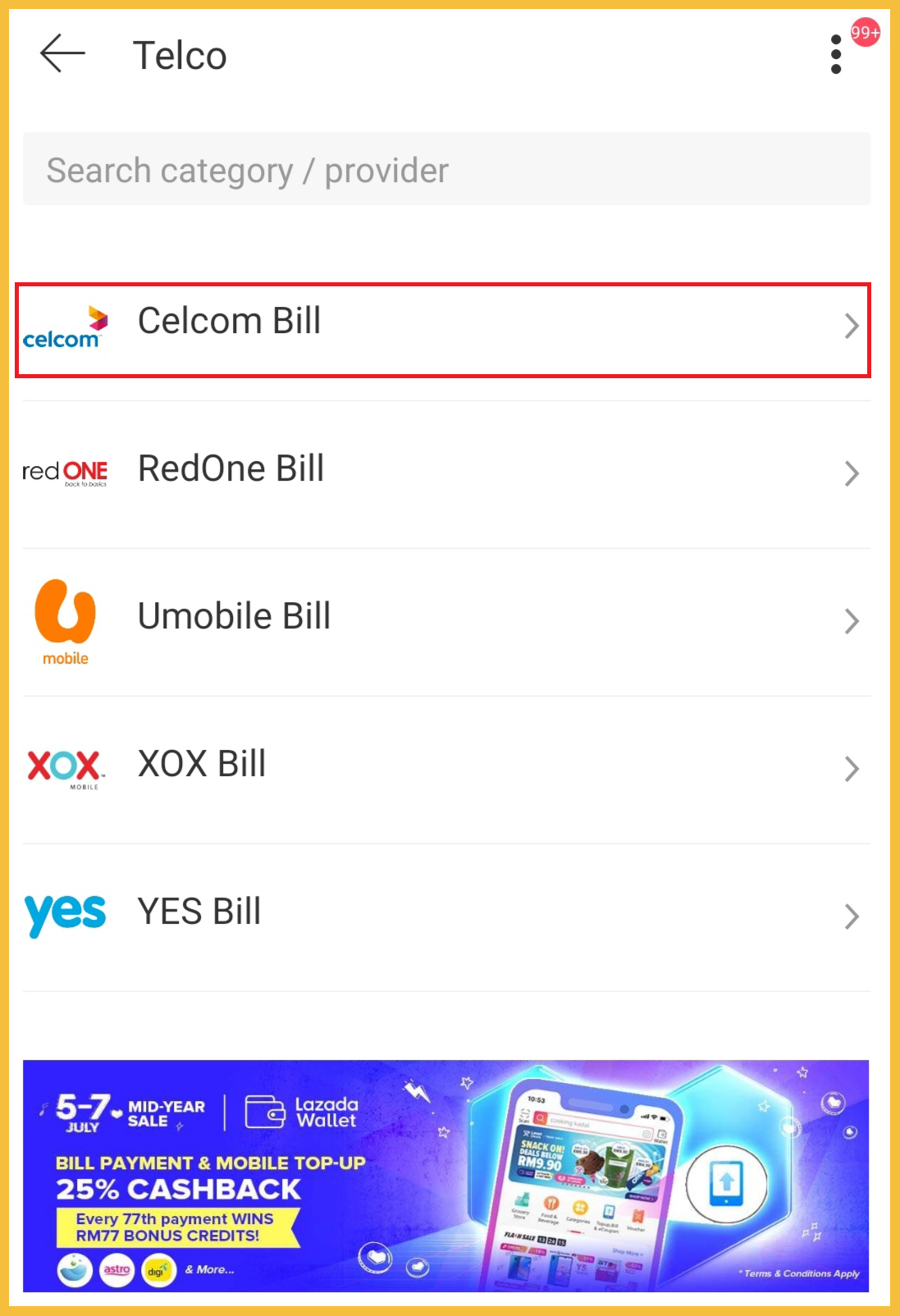 步骤4:选择你的电讯公司。比如:选择“Celcom Bill”