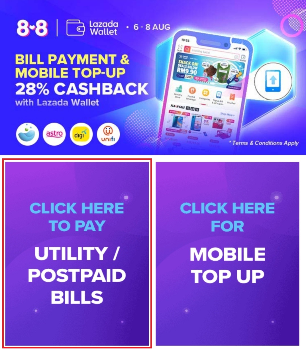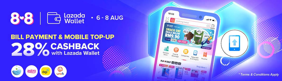 为了配合【8.8】网购日的到来,大马网购平台Lazada 即日起至8月8日推出缴付账单可获得28%回扣!最低缴付RM20 可获高达RM5 回扣!