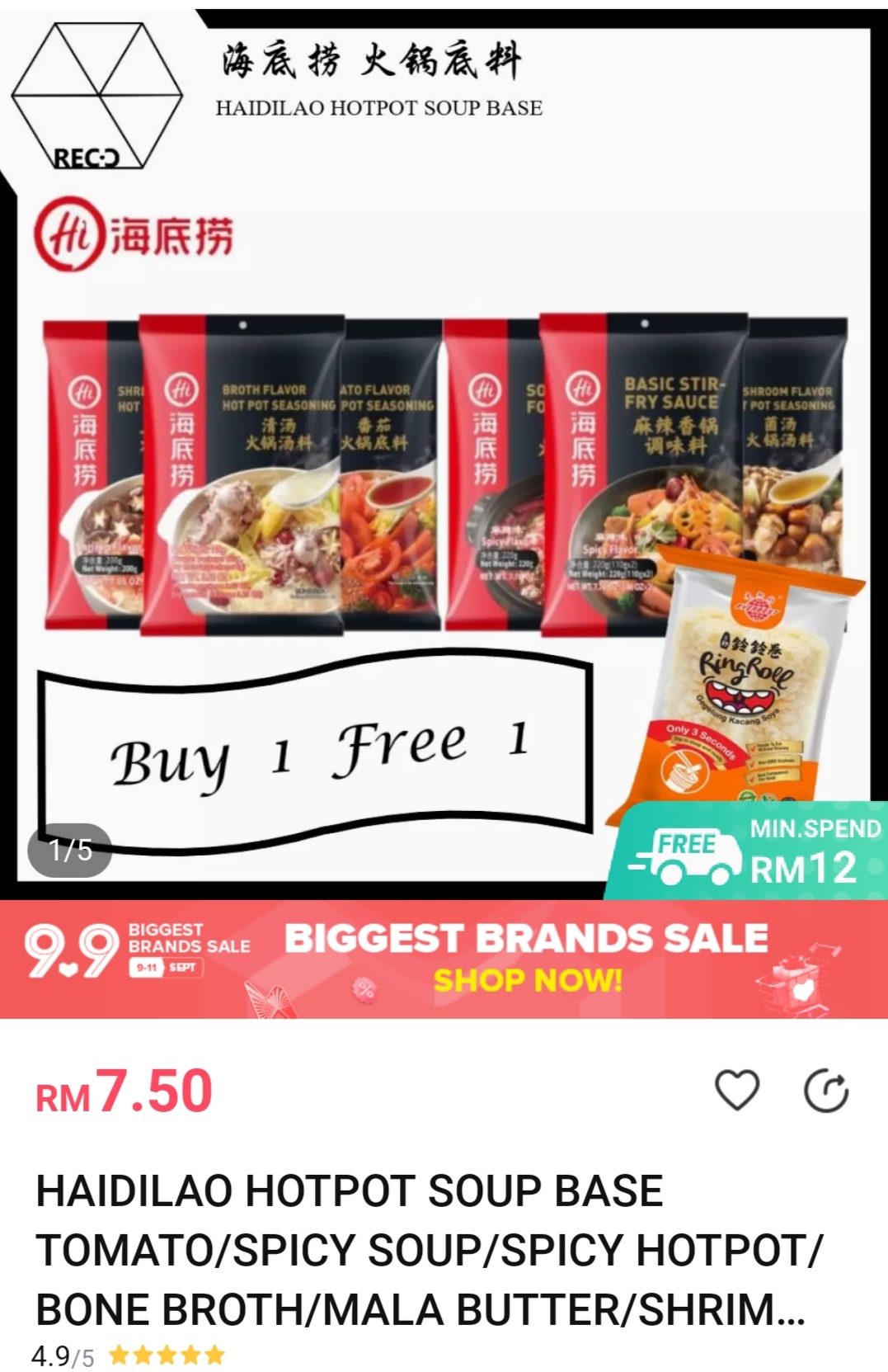 ▼ 2包海底捞火锅底料(原价RM15)折扣RM5 +免邮券,只需RM10!平均一包只需RM5!