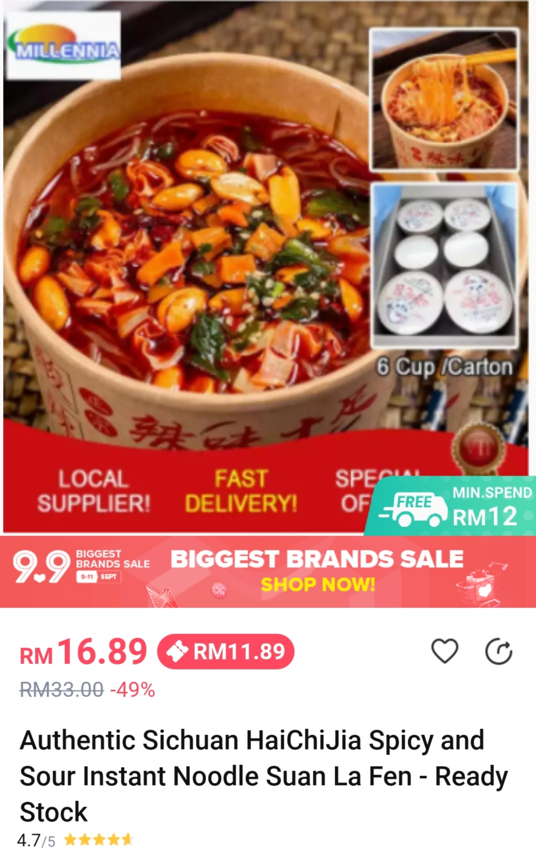 ▼1箱6杯酸辣粉(原价RM16.89)折扣RM5 +免邮券,只需RM11.89!平均一杯只需RM1.98!