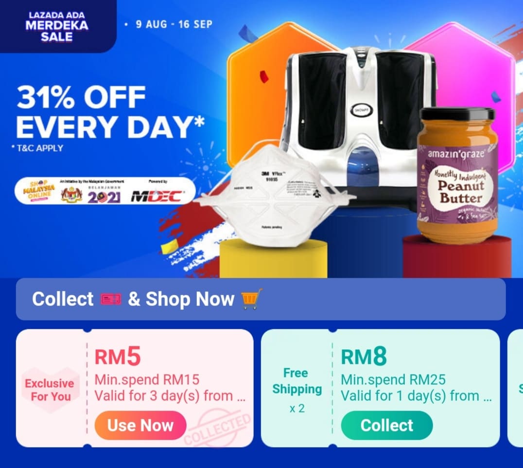 ① 首先打开Lazada App,领取RM5 折扣券和免邮券【点击这里】(折扣券需通过Lazada App 查看及领取)