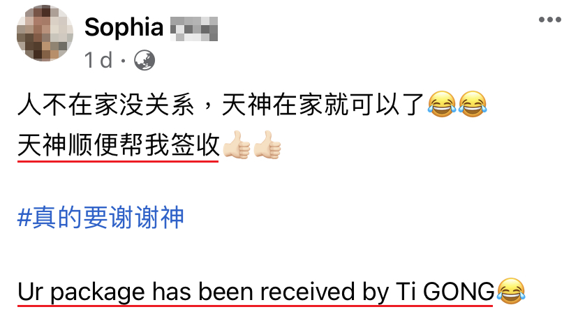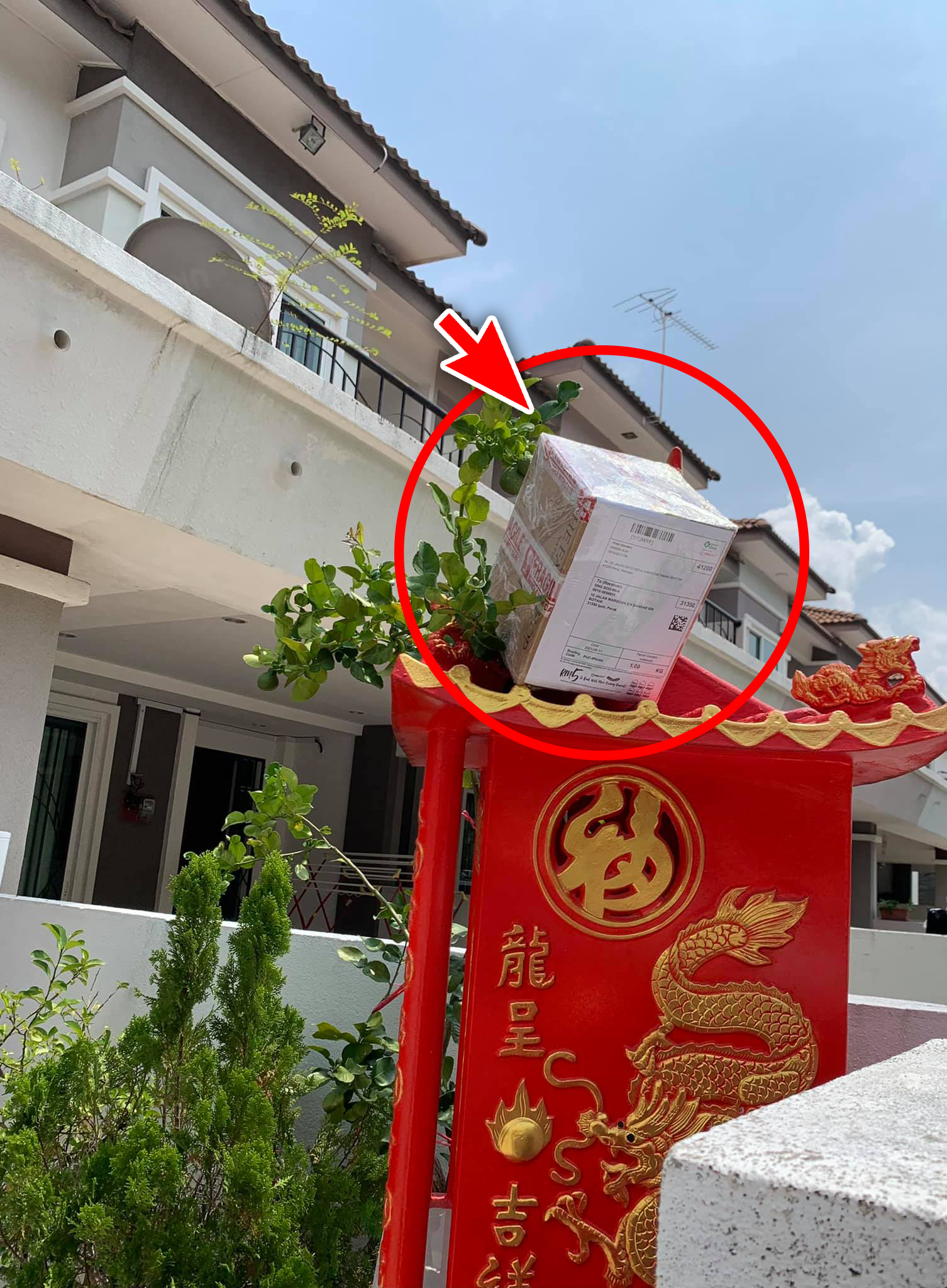 ▼ 据帖文透露,送货员送包裹来的时候,由于家里没有人所以送货员就把包裹留下来。贴心的送货员相信是担忧顾客的包裹会被偷走,所以为了安全起见,送货员非常机智地把包裹放到天宫神台上,一箱四四方方的包裹就这样稳稳地放在上面!