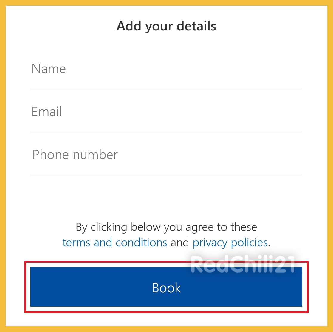 步骤6:输入你的名字、电邮和手机号码。点击“Book”。