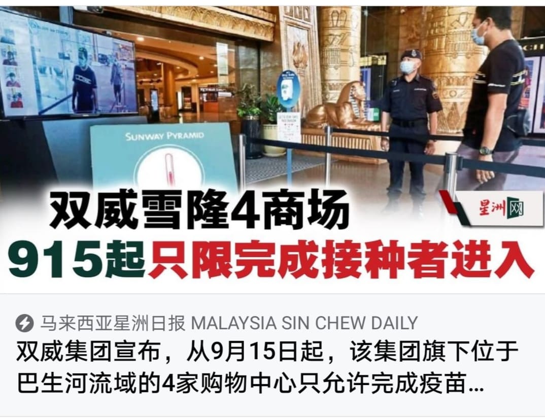 双威集团宣布,从9月15日起,该集团旗下的4家购物中心,双威金字塔(Sunway Pyramid)、双威伟乐城(Sunway Velocity)、双威太子广场(Sunway Putra Mall)和双威吉萨购物中心(Sunway Giza),只允许完成疫苗接种的民众进入。