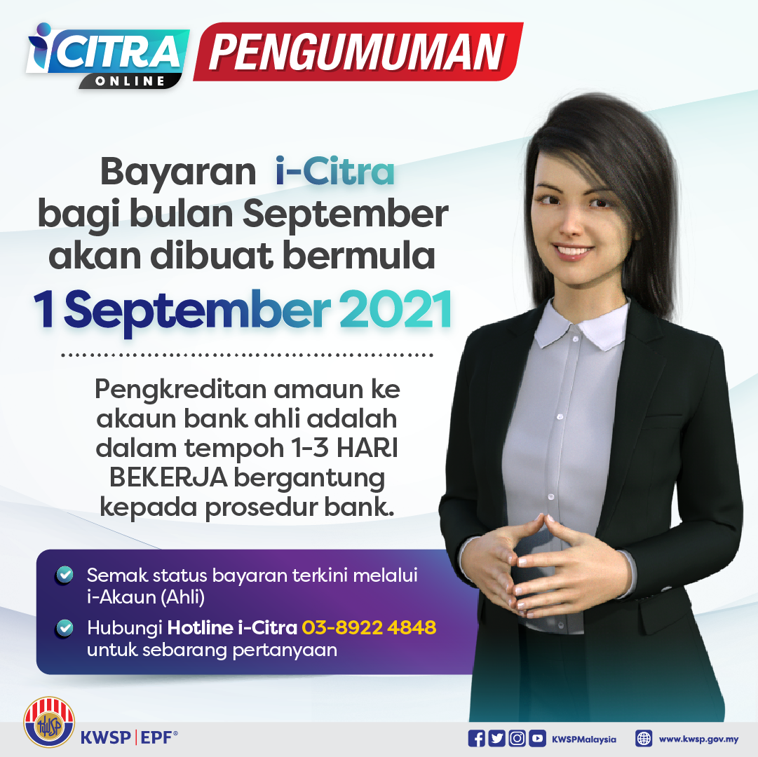 雇员公积金局(KWSP)宣布,i-Citra 的款项将在9月1日起发放。款项需要1至3个工作日才会汇入会员的银行户口。