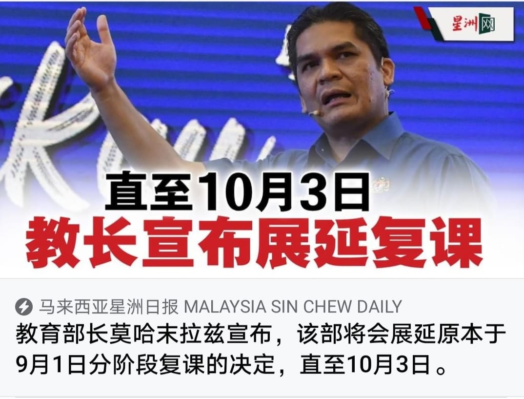 教育部高级部长宣布,原本于9月1日分阶段复课,将会继续进行居家学习,直到10月3日。且将会分阶段开始返校复课,并优先让考试班的学生返校上课。