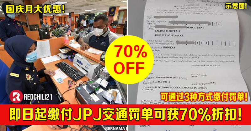 为了配合国庆月,陆路交通局(JPJ)从即日起至9月16日推出所有拖欠交通罚单的车主可享有70%折扣!