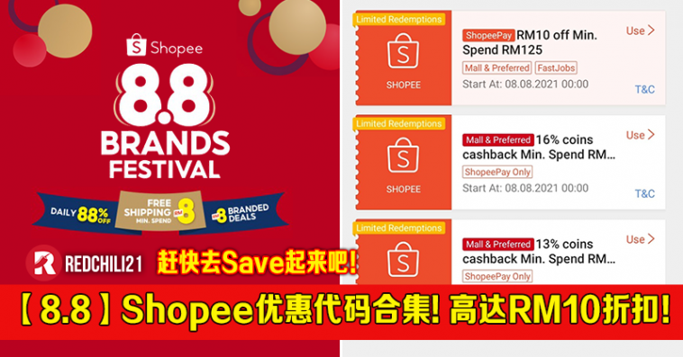 这次Shopee【8.8】促销优惠,不仅可领取银行卡折扣券之外,还特别推出一系列Shopee 折扣券和Coins 优惠券,高达RM10 折扣!现在就把这些优惠代码Save 起来吧!