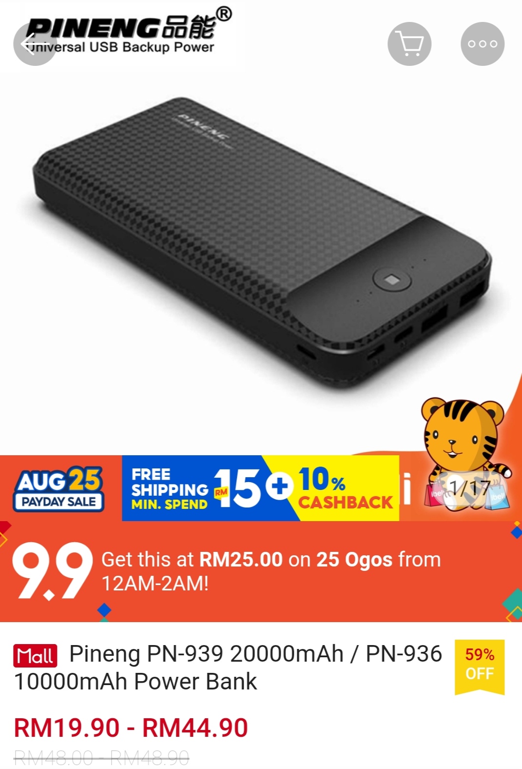 ▪ Pineng PN-939 20000mAh / PN-936 10000mAh Power Bank – RM19.90 – RM44.90 RM25