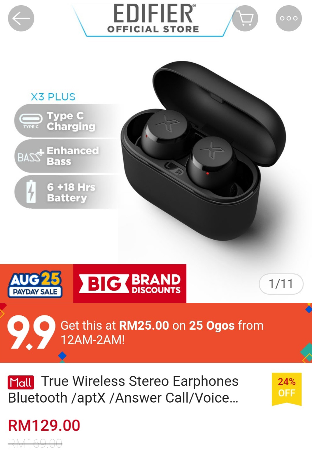 ▪ Edifier X3 Plus/X3+ True Wireless Stereo Earphones Bluetooth – RM129 RM25