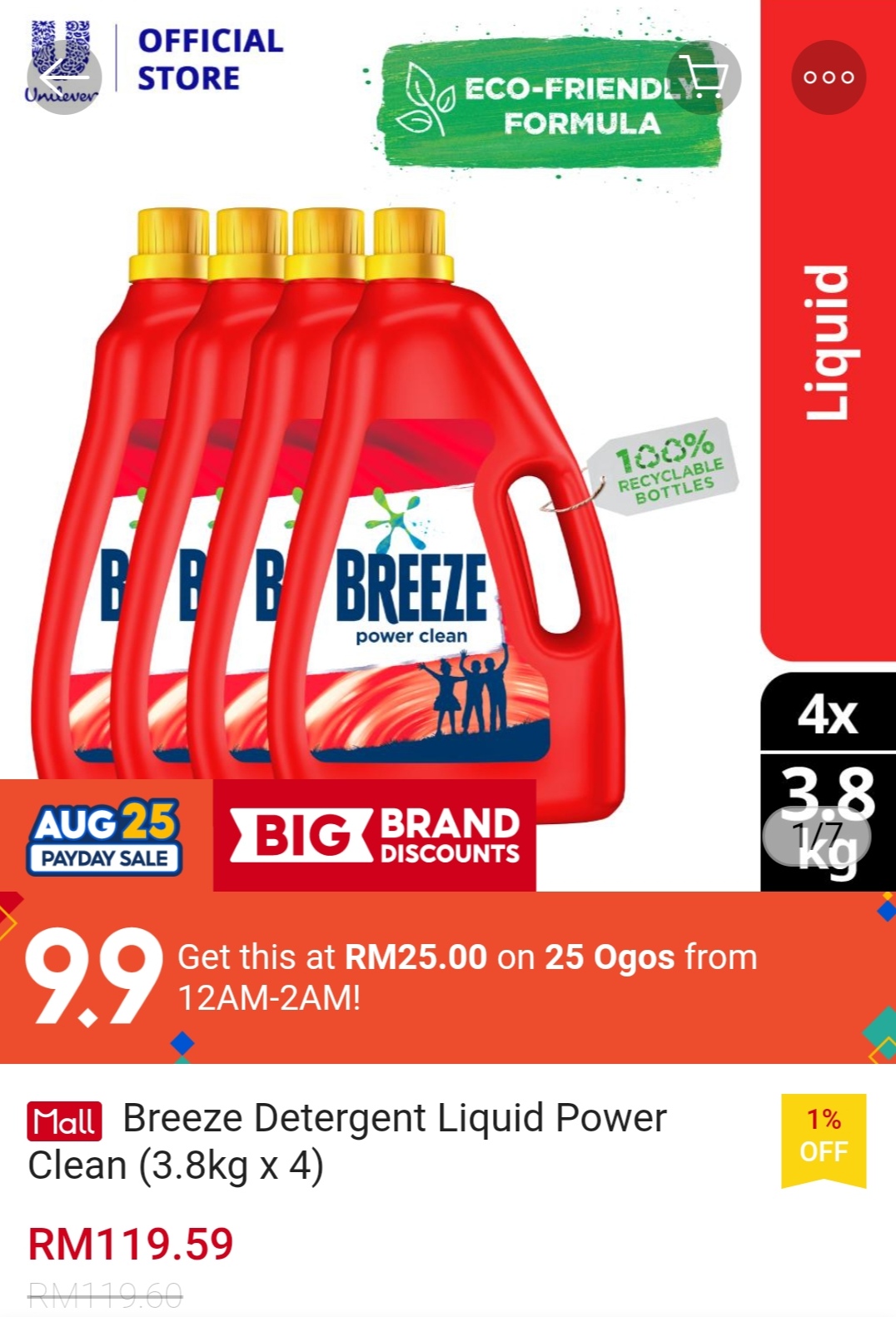 ▪ Breeze Detergent Liquid Power Clean (3.8kg x 4) – RM119.59 RM25