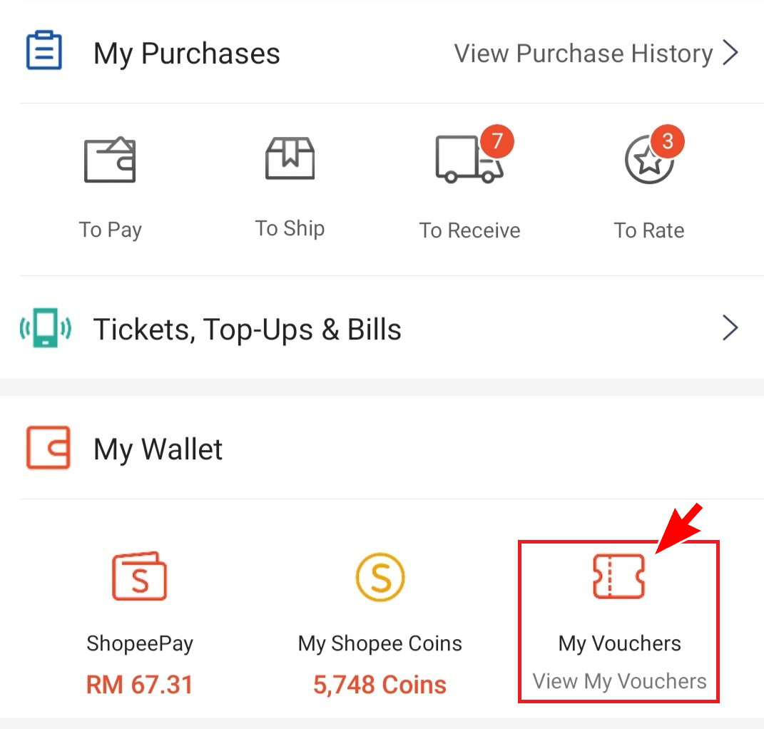 步骤1:打开Shopee App,点击“Me”后打开“My Vouchers”。(或者直接点击链接【点击这里】)