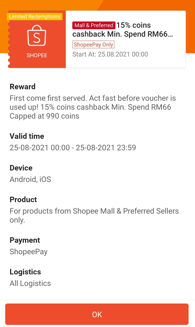 ▼②  消费RM66,可获得15%现金回扣,高达990 Coins(RM9.90)!