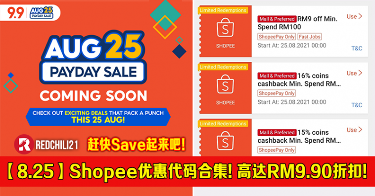 这次Shopee【8.25】促销优惠,不仅可领取银行卡折扣券之外,还特别推出一系列Shopee 折扣券和Coins 优惠券哦,高达RM9.90!现在就把这些优惠代码Save 起来吧!
