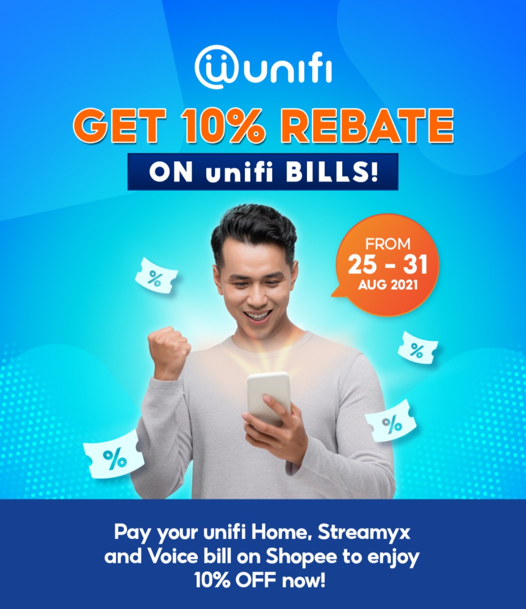 大马Shopee 将从8月25日至8月31日推出缴付Unifi 账单活动!只要你通过Shopee 缴付Unifi 账单可享有高达10%折扣(最高可折扣RM10)!