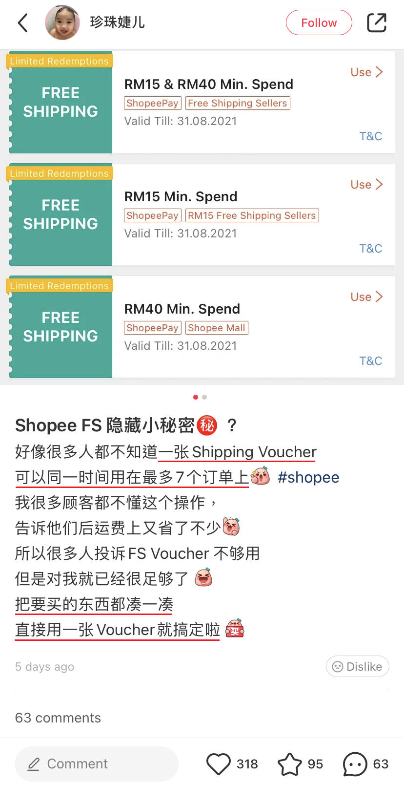 一名小红书网友分享了一个很多人都不知道的 Shopee 隐藏小秘密,原来 Free Shipping voucher 可以这样用的!这么一来就省下了不少钱啊!
