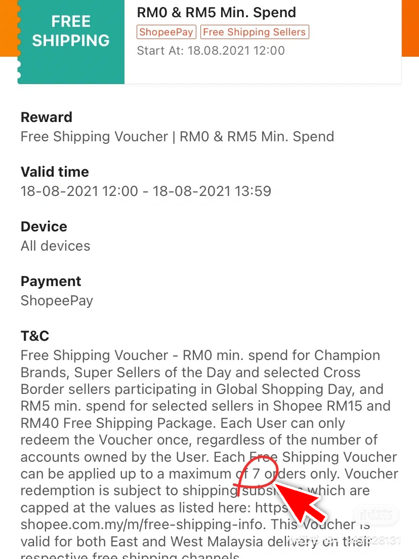 ▼ 若你仔细阅读免运券的条款和条件(terms & conditions),就会发现其实 Shopee 有清楚地注明:「每一张免运券仅可以使用最多7个订单。」