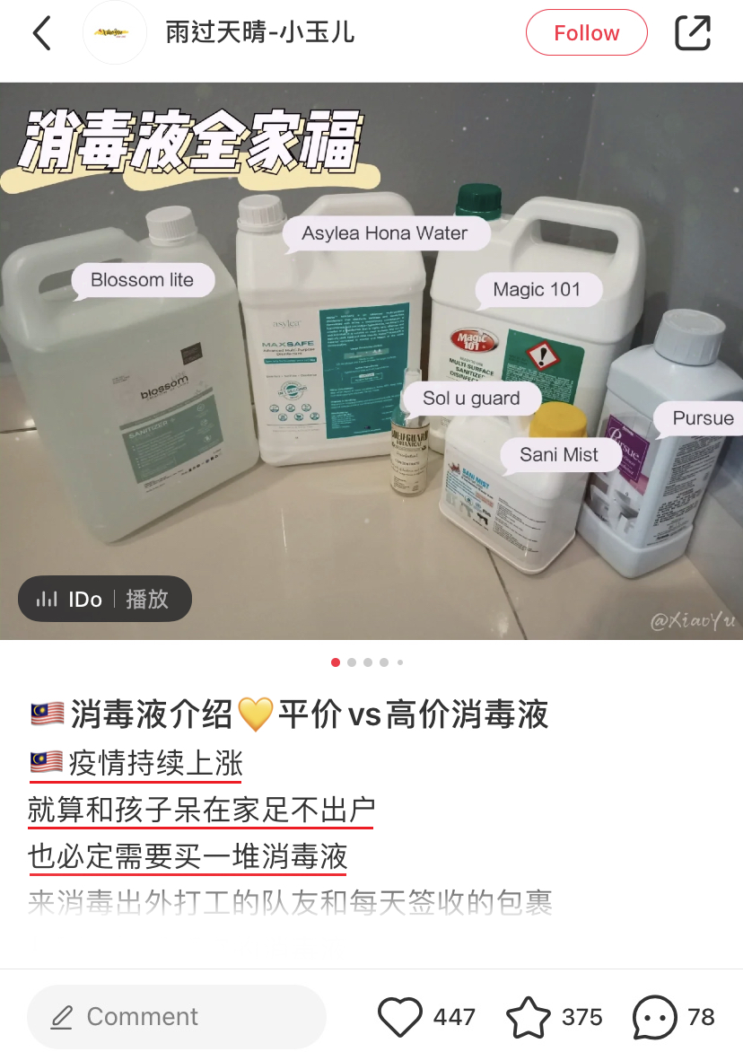 一名大马博主日前在小红书推荐她使用过的6款消毒液,从平价到高价的都有,每一款的实用性都略有不同哦!