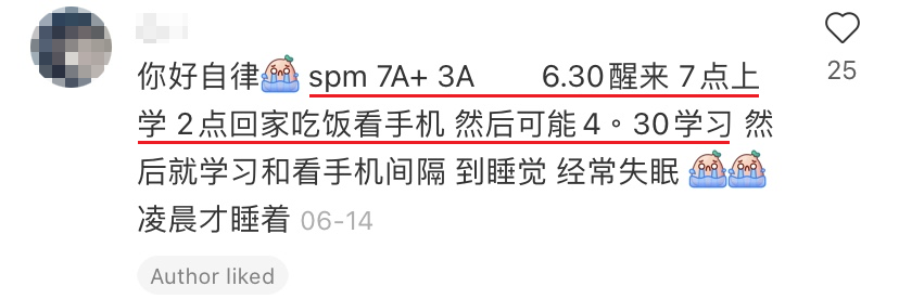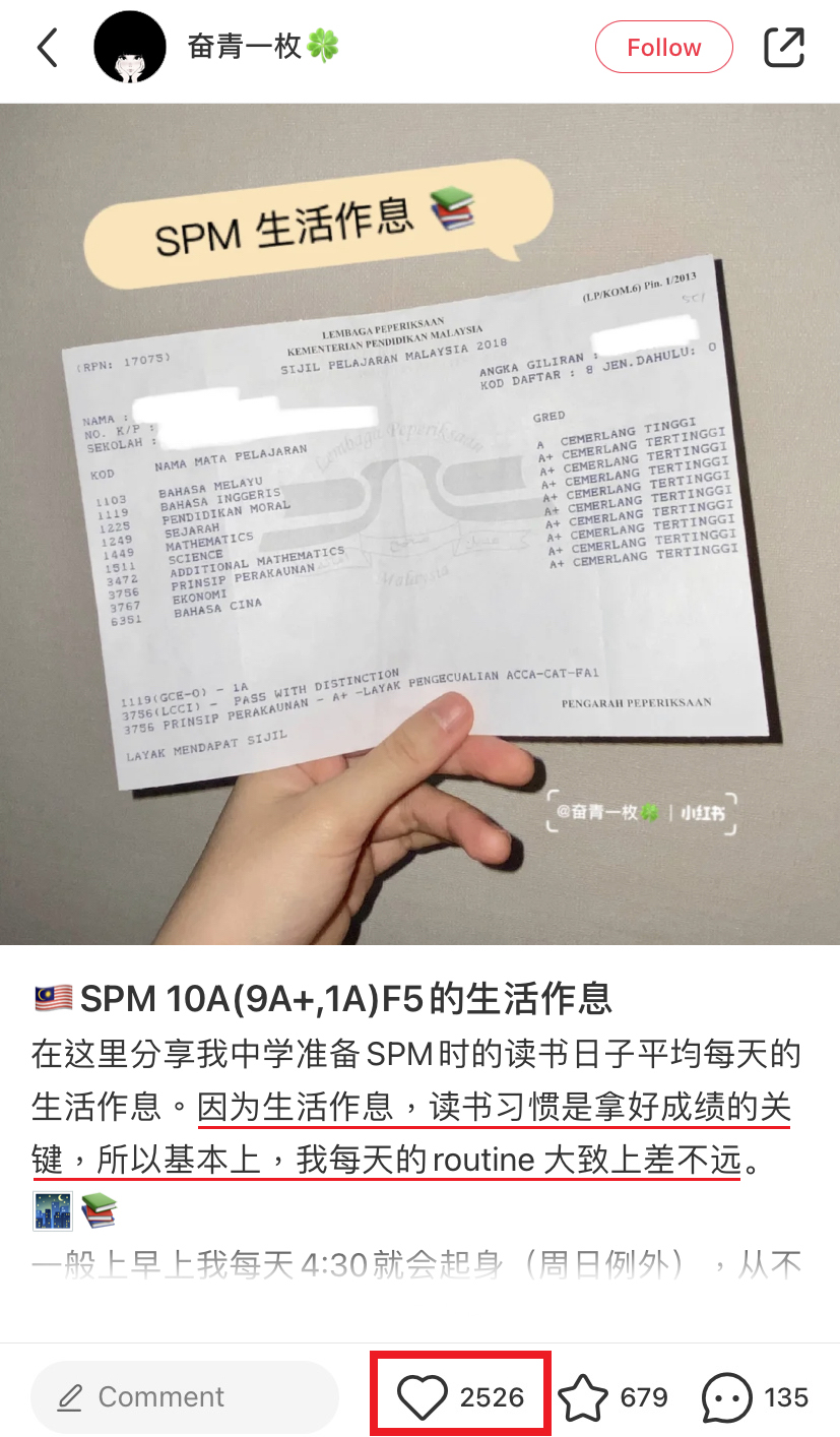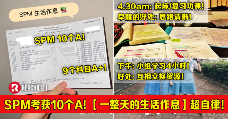 一名大马女生在小红书分享她SPM考试前的作息,每天清晨4点半起床开始一天充实的生活,因为她的自律让她在SPM考试中取得10个A的优越成绩!