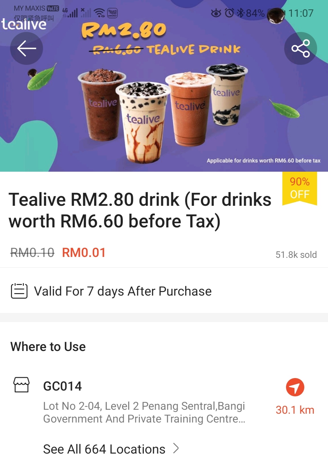 ▼ 在Shopee App 购买Tealive RM0.01 饮料礼券【点击这里】!并在有效期限内到指定分行兑换就行了!注意,是以RM2.80 优惠价来购买价值RM6.60 饮料!
