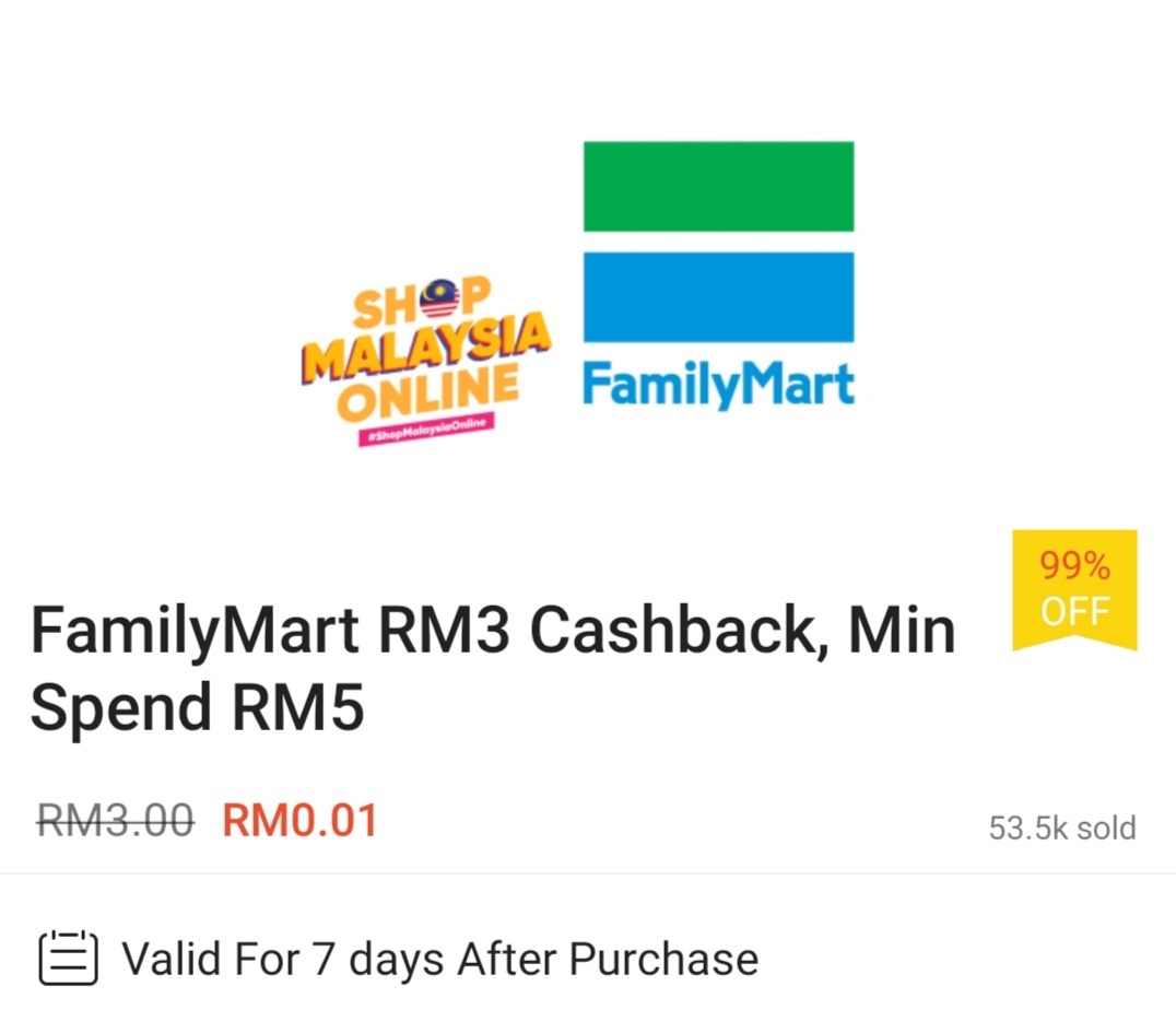 ▼ 另外,在Shopee App 购买FamilyMart 现金回扣礼券只需RM0.01!只需消费RM5就可获得RM3 现金回扣!