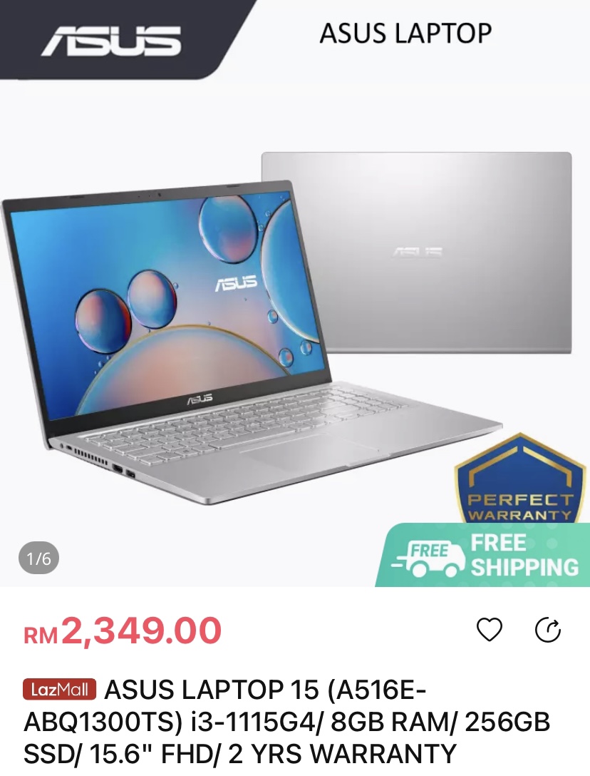 ▪ ① ASUS LAPTOP 15 (A516E-ABQ1300TS) i3-1115G4/ 8GB RAM/ 256GB SSD/ 15.6″ FHD/ 2 YRS WARRANTY