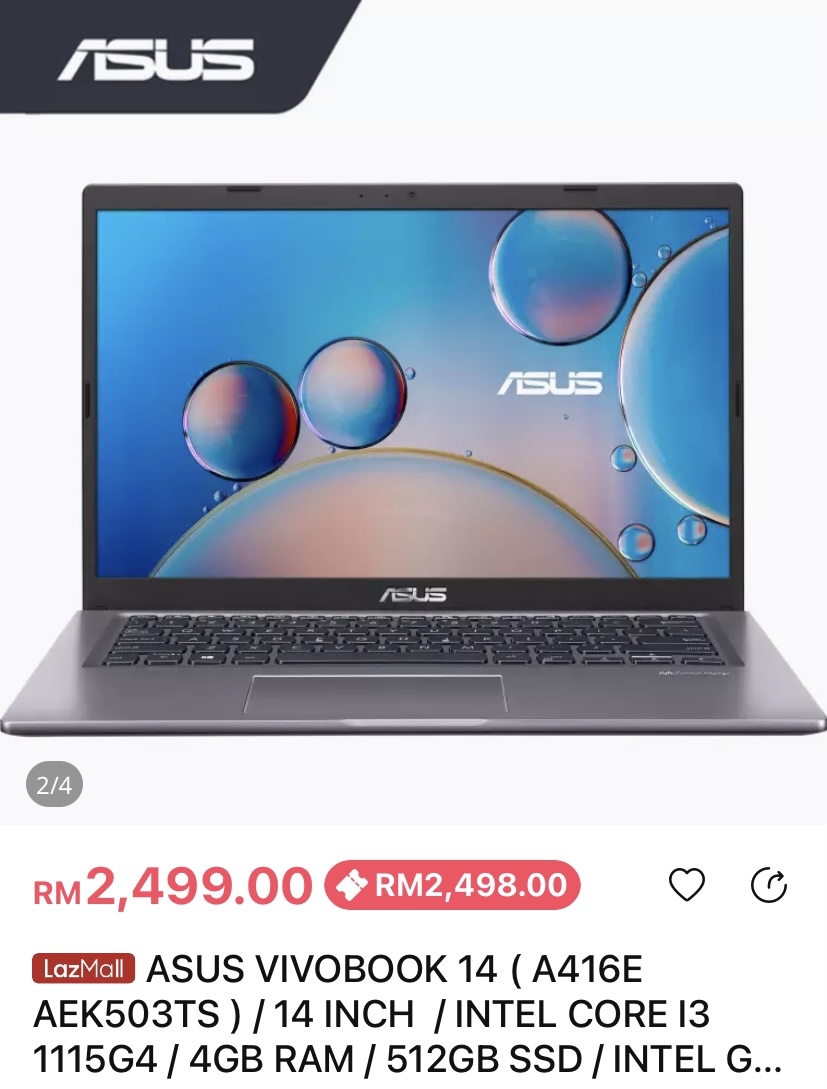 ▪ ② ASUS VIVOBOOK 14 ( A416E AEK503TS ) / 14 INCH / INTEL CORE I3 1115G4 / 4GB RAM / 512GB SSD / INTEL GTRAPHIC / WINDOWS 10 Free Microsoft Office Home & Student / 2 YEARS WARRANTY)