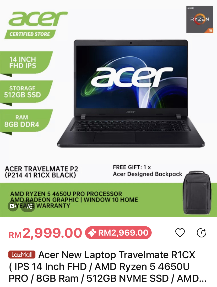 ▪ ④ Acer New Laptop Travelmate R1CX ( IPS 14 Inch FHD / AMD Ryzen 5 4650U PRO / 8GB Ram / 512GB NVME SSD / AMD RADEON / Window 10 / 1 Year Warranty)
