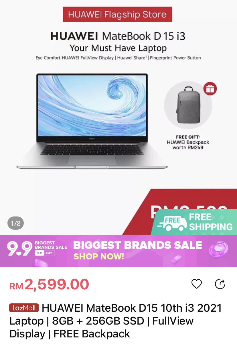 ▪ ⑤ HUAWEI MateBook D15 10th i3 2021 Laptop | 8GB + 256GB SSD | FullView Display | FREE Backpack