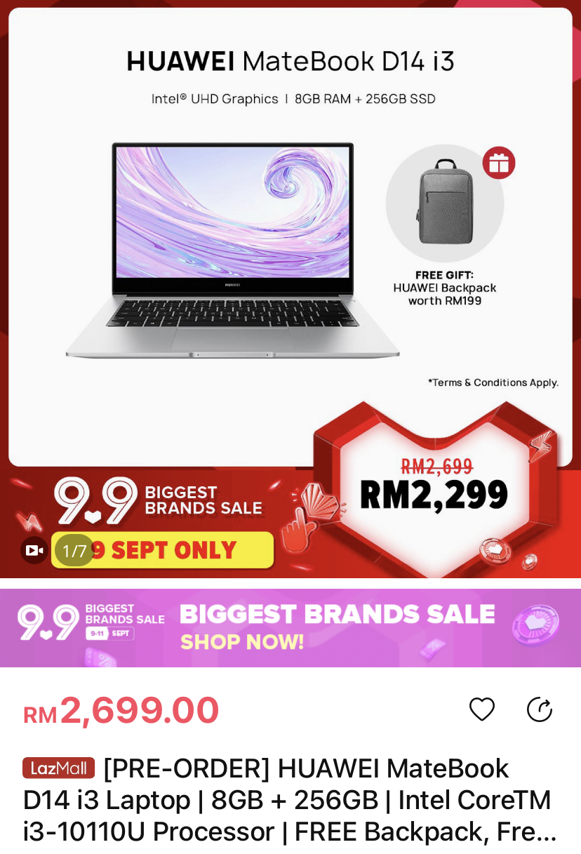▪ ⑥ [PRE-ORDER] HUAWEI MateBook D14 i3 Laptop | 8GB + 256GB | Intel CoreTM i3-10110U Processor | FREE Backpack, Free Shipping (ETA: 9 Sept)
