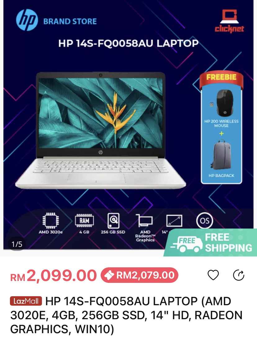 ▪ ⑧ HP 14S-FQ0058AU LAPTOP (AMD 3020E, 4GB, 256GB SSD, 14″ HD, RADEON GRAPHICS, WIN10)