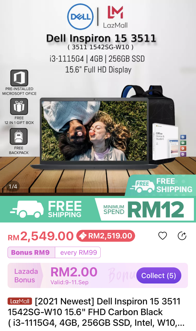 ▪ ⑨ [2021 Newest] Dell Inspiron 15 3511 1542SG-W10 15.6″ FHD Carbon Black ( i3-1115G4, 4GB, 256GB SSD, Intel, W10, HS )