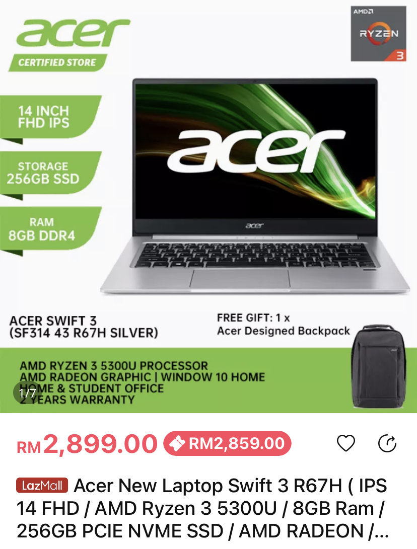 ▪ ③ Acer New Laptop Swift 3 R67H ( IPS 14 FHD / AMD Ryzen 3 5300U / 8GB Ram / 256GB PCIE NVME SSD / AMD RADEON / Window 10 + Microsoft Office Home & Student / 2 Years Warranty)