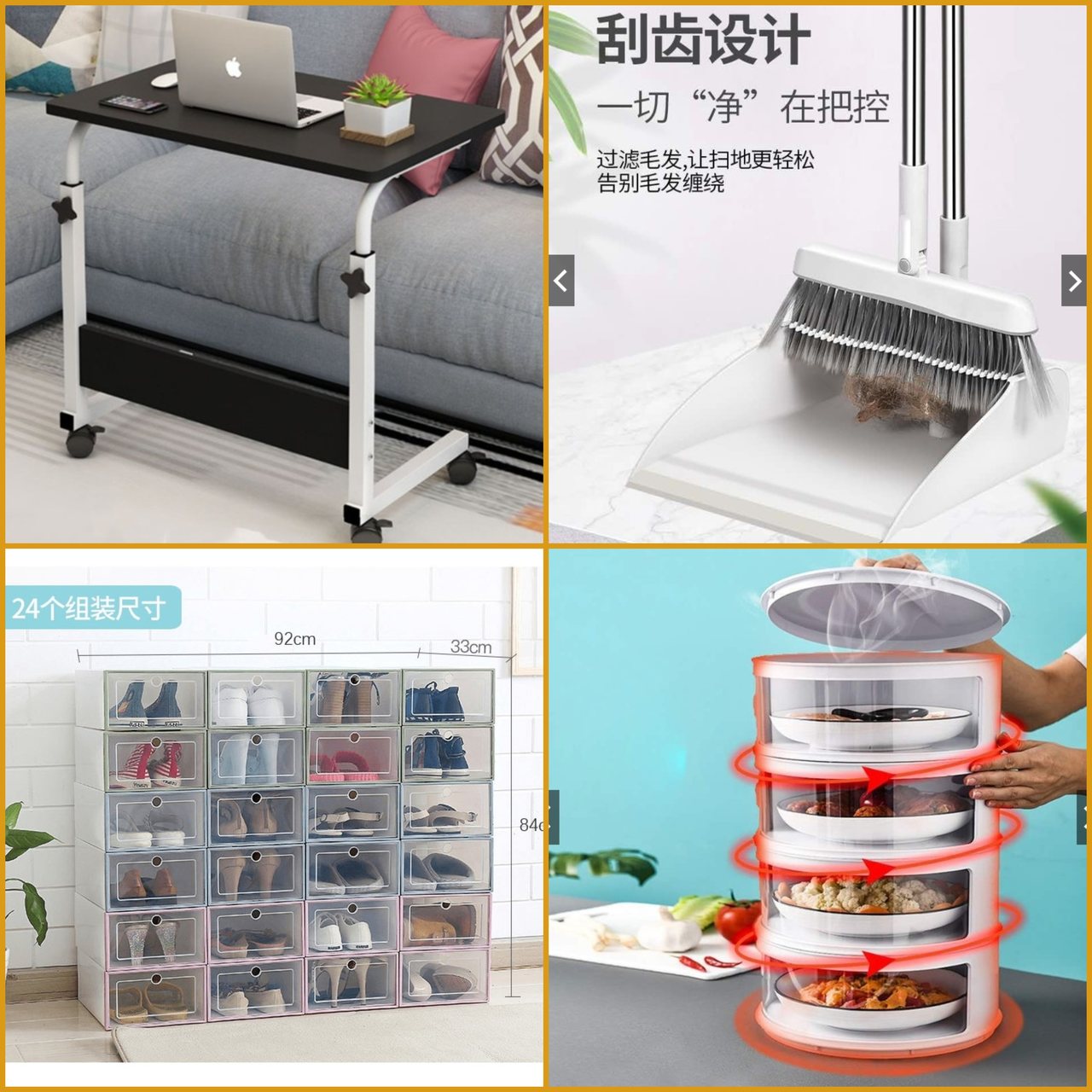 这家店铺售卖的商品种类繁多,有收纳鞋盒、移动式办工桌以及一些家里常用的用具等!所售卖的价格也合理!