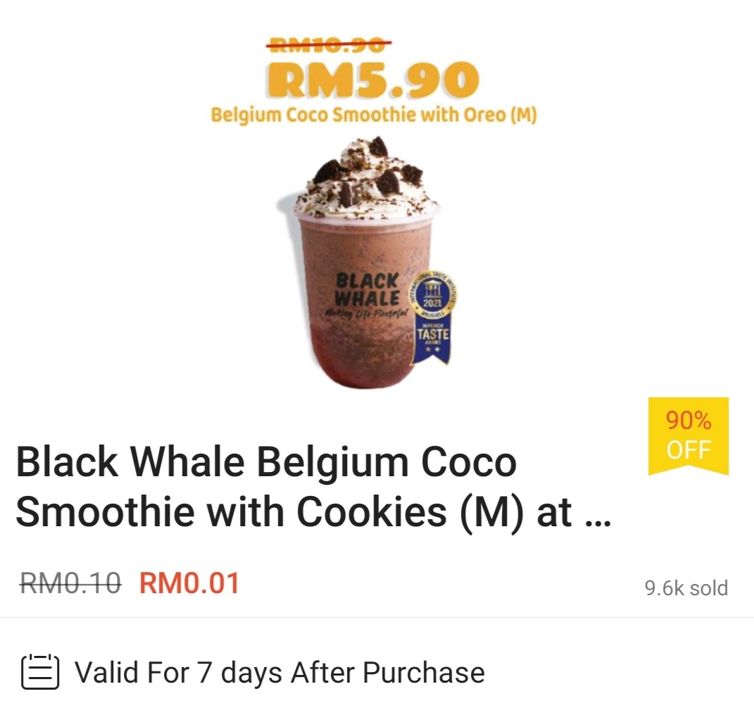 ii)Black Whale Belgium Coco Smoothie With Cookies(M)—— RM5.90(需使用RM0.01 来购买饮料礼券)