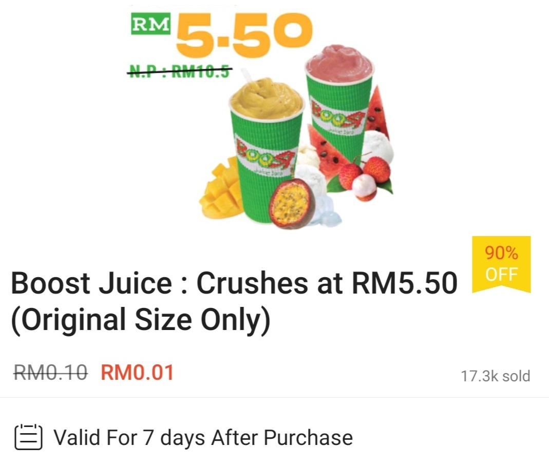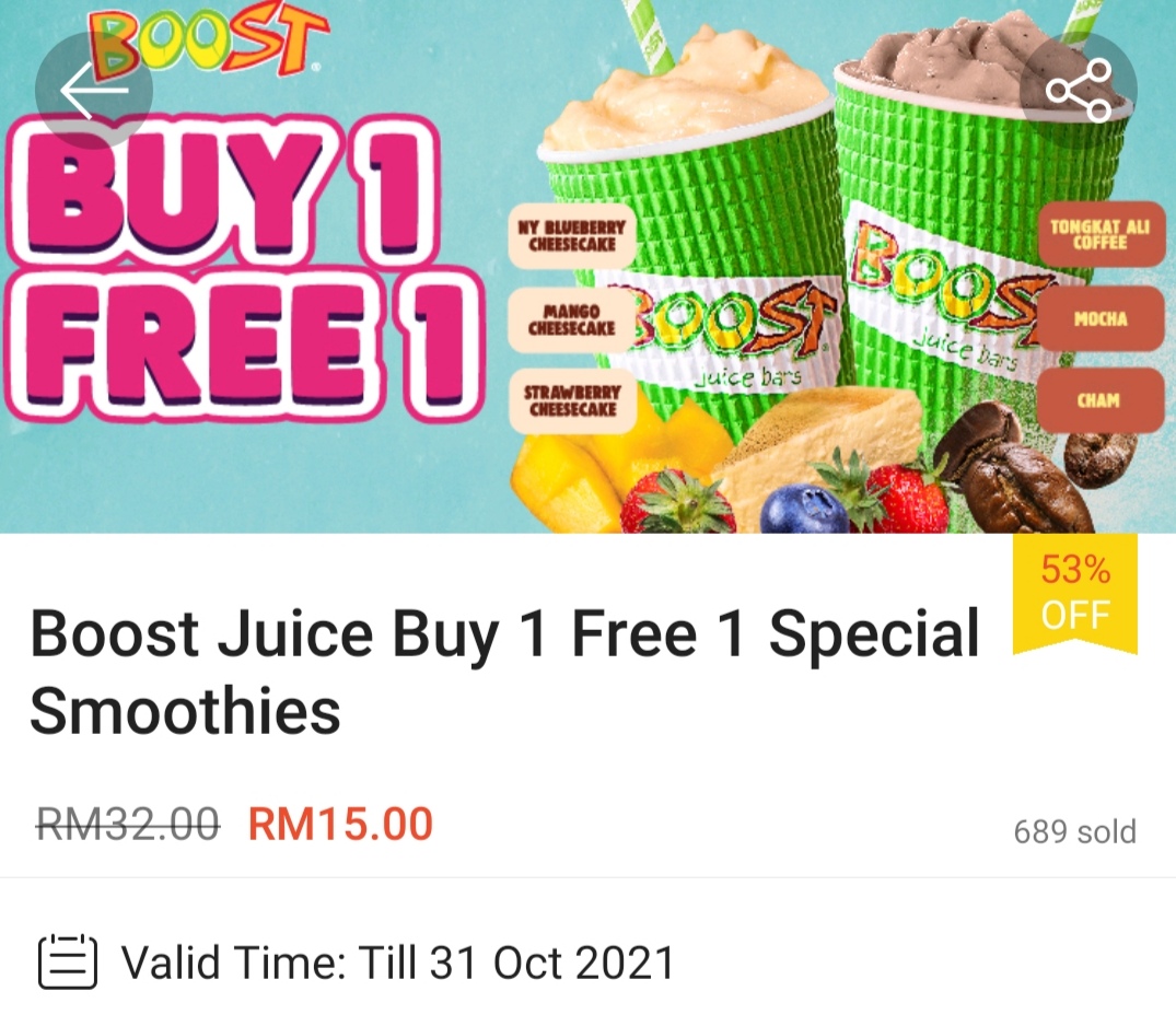 ⑧ Boost Juice —— 果汁最低RM5.50(需使用RM0.01 来购买饮料礼券)