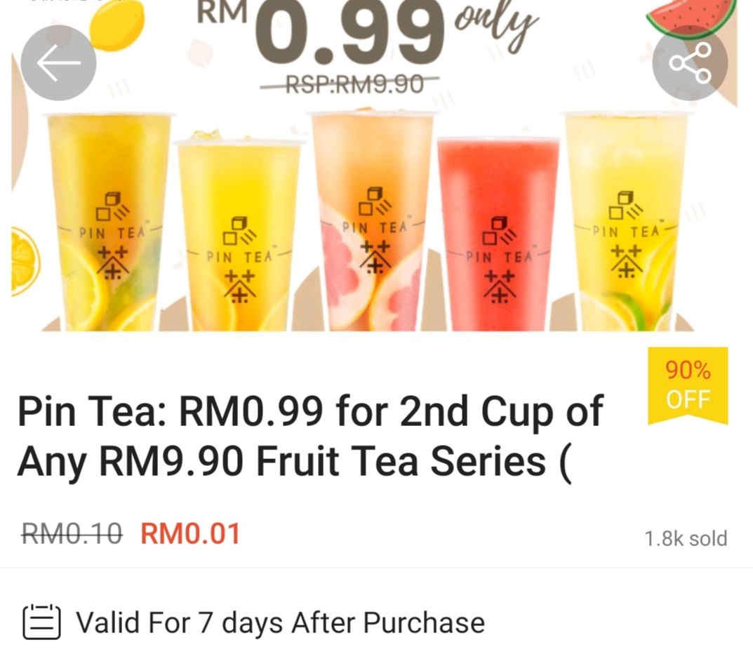 ⑦ Pin Tea —— 第二杯饮料只需RM0.99(需使用RM0.01 来购买饮料礼券)