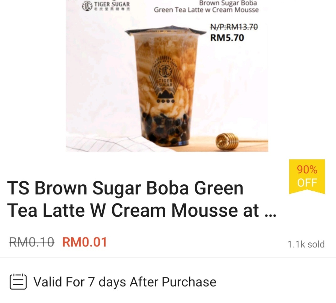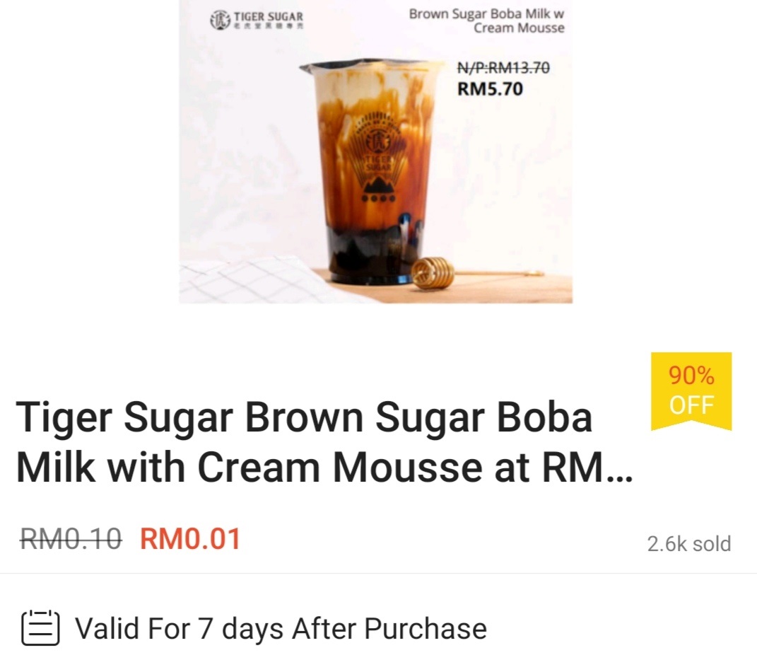 ⑥ Tiger Sugar 老虎堂 —— 饮料只需RM5.70(需使用RM0.01 来购买饮料礼券)