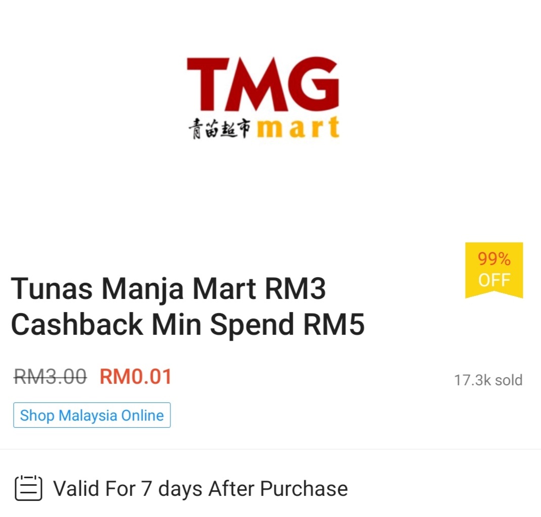 ▼① TMG Mart – 消费RM5 可获得RM3 现金回扣;购买【点击这里】