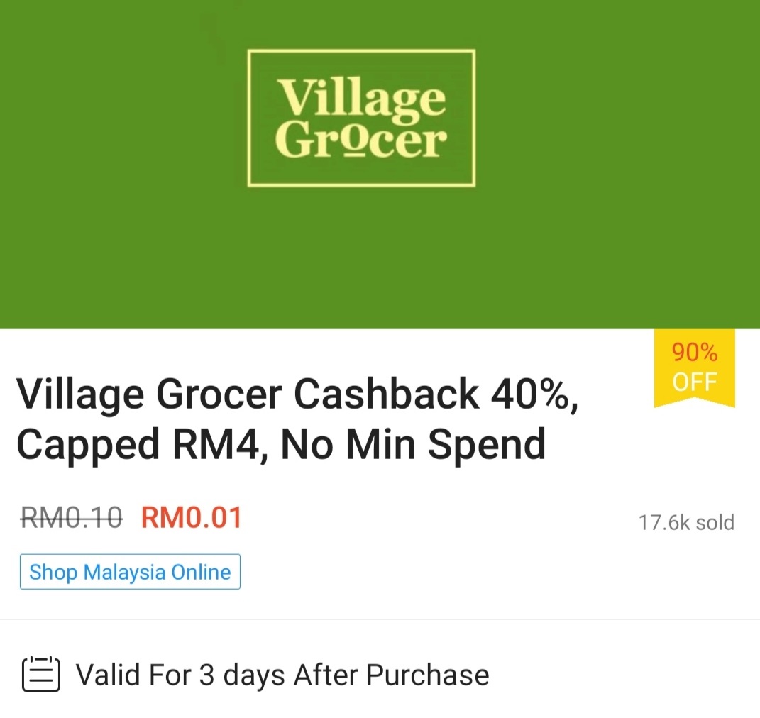 ▼③ Village Grocer – 可享有高达RM4 回扣(无限最低消费);购买【点击这里】
